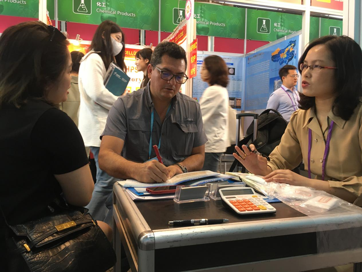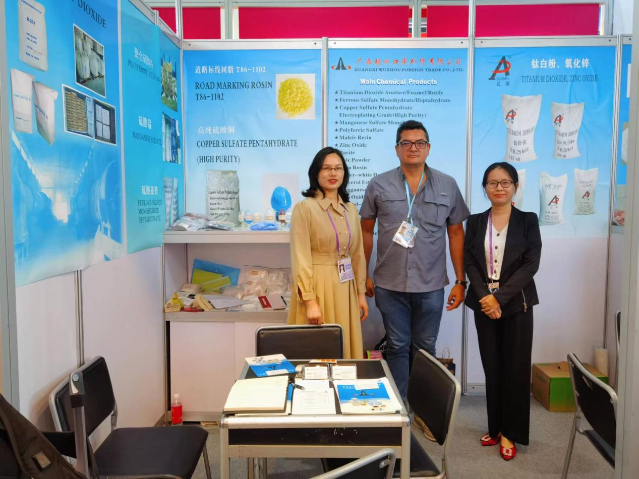 梧州口岸公司共參加三期廣交會線下展,每期參展產(chǎn)品均為公司出口業(yè)務(wù)的拳頭產(chǎn)品,包括鈦白粉(二氧化鈦)、高純度硫酸銅、氧化鋅、松香、八角及木衣架等化工品、土畜產(chǎn)品、保健品和輕工工藝品。各業(yè)務(wù)部門搶抓機遇,精心準(zhǔn)備產(chǎn)品樣板,認(rèn)真布展,并通過視頻、圖片、文字及樣品展示等方式,全方位推介參展產(chǎn)品,備受境內(nèi)外客商青睞。所在展位的客商訪問量和初步意向簽約量均頻頻告捷。參展首日,展位訪問量平均每小時70余人次,有初步采購意向的占比達10%。
